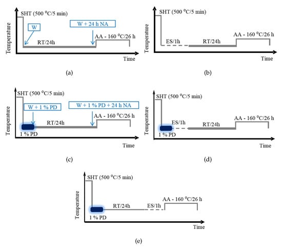 Description of the five processing routes. All routes include a solution heat treatment (SHT) at 500 °C for 5 min in a salt bath, followed by water-quench (W) to room temperature (RT), natural ageing (NA) for 24 h and artificial ageing (AA) at 160 °C for 26 h. (a) The reference material; (b) elastic straining (ES) was applied at 50% of the material yield strength for 1 h directly after SHT. The material was then naturally aged and artificially aged; (c) 1% plastic deformation (PD) was applied directly after SHT. The material was then naturally aged and artificially aged; (d) 1% plastic deformation was applied directly after SHT, immediately followed by elastic straining for 1 h at 50% of the material yield strength. The material was then naturally and artificially aged; (e) 1% plastic deformation was applied directly after SHT, followed by natural ageing and then 1 h elastic straining at 50% of the material yield strength. Finally the material was artificially aged. The text-boxes with arrows indicate the four conditions presented in Figure 3. Water quench to room temperature is denoted ‘W’.