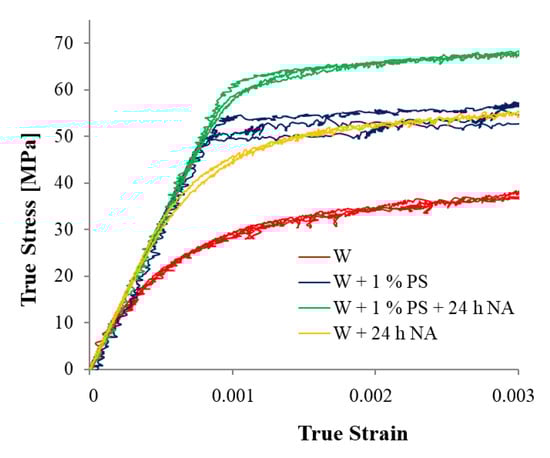 1% plastic deformation was applied at room temperature immediately after water quench from SHT, see Figure 2c, similar to an industrial process. The nominal strain rate used for 1% plastic deformation was 10 s. The combinations of plastic deformation and elastic strain are illustrated in Figure 2d,e. The true stress–logarithmic strain curves were obtained by a standard tensile testing set-up in an MTS810 hydraulic test machine operated at an initial nominal strain rate of 10 s, with a 25 mm extensometer.