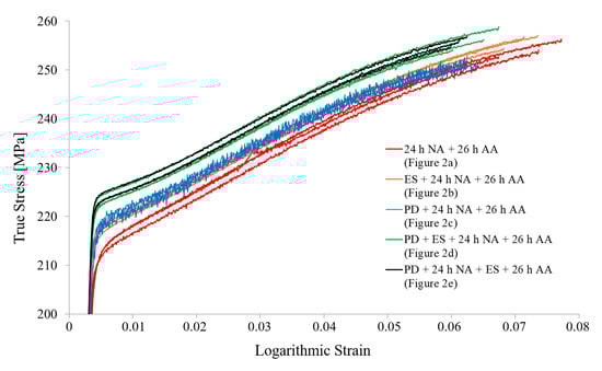 Further tensile testing was performed for all five processing routes after 26 h of artificial ageing, and are presented in Figure 4. The tensile test results, showing stress as a function of logarithmic strain, are presented in Figure 4. Considering Figure 4 the tensile results can be divided into three relative classes of strength. Lower strength: The reference sample (Figure 2). Medium strength: The material with only elastic strain and the material with only 1% plastic deformation (Figure 2b,c, respectively). Higher strength: The two combinations of 1% plastic deformation and elastic strain (Figure 2d,e, respectively). The combination of elastic strain and plastic deformation increases the strength by 12–15 MPa relative to the reference. Surprisingly, only subjecting the material to elastic strain also leads to increased strength.