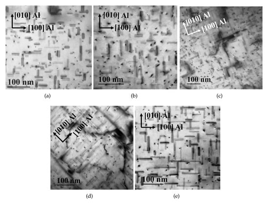 TEM images from each processing route after artificial ageing, taken along the <001>Al zone axis. See arrows indicating crystal directions in each image. (a) Reference sample (Figure 2a); (b) elastic strain before natural ageing (Figure 2b); (c) 1% plastic strain (Figure 2c). Dislocations can be observed in several areas; (d) 1% plastic strain and elastic strain before natural ageing (Figure 2d). An example of the dislocation cells frequently found; (e) 1% plastic strain, then natural ageing, then elastic straining (Figure 2e). The microstructure in (d,e) is very similar, see Table 2, dislocation cells and precipitates are emphasized in (d,e), respectively.