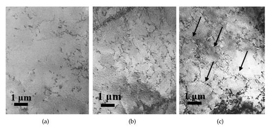 Figure 6a shows a relatively low dislocation density in the reference material, with no visible dislocation cell formation. As expected, after applying 1% plastic deformation the dislocation density has increased to such an extent that it is visible by eye. For the material which was subjected to both plastic deformation and elastic strain, there is a further increase in dislocation density accompanied by a significant cell formation of tangled dislocations, see Figure 6c.