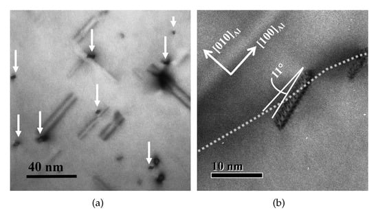 (a) A dislocation-free area exhibiting ” cross sections in the reference material, indicated by white arrows; (b) B’ precipitate on a dislocation line in the plastically deformed material. The dislocation is indicated by white dashed lines. The two images were taken along a <001>Al crystal direction.