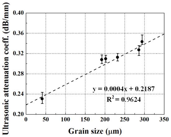 The ultrasonic attenuation coefficient as a function of grain size is shown in Figure 6, where both the average value and the data range for ten repeated measurements are shown. All measurements were made in the Rayleigh scattering region. The average attenuation coefficient was 0.2305 dB/mm for the intact specimen with a grain size of 41 μm, and it approximately doubled to 0.3433 dB/mm as the grain size increased to 294 μm. There was also a linear relationship between the attenuation coefficient and the grain size, but the correlation coefficient was 0.9624, which was lower than that between the ultrasonic velocity and the grain size. However, the sensitivity of the ultrasonic attenuation coefficient to the change in grain size and the stability of ultrasonic attenuation measurements were better than those in the ultrasonic velocity measurements.