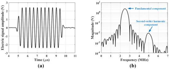(a) Typical tone-burst ultrasonic signal; and (b) its frequency spectrum used for the nonlinear ultrasonic measurement.