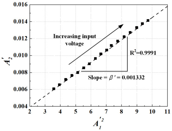 Linear relationship between A2′ and (A1′)2 as a function of increasing input voltage level in the intact specimen.