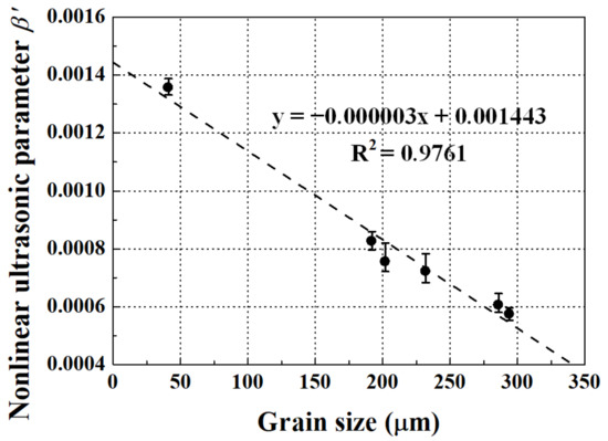 The average values and the data ranges of the measured nonlinear ultrasonic parameters as a function of grain size are shown in Figure 9. The average nonlinear ultrasonic parameter was 0.001356 for the intact specimen, and it was reduced by about half as the grain size increased to 294 μm. The tendency of the nonlinear ultrasonic parameter to decrease with increasing grain size was the same as that of the ultrasonic velocity, while it was the opposite that of the ultrasonic attenuation coefficient. A linear relationship between the nonlinear ultrasonic parameter and the grain size was also observed with a correlation coefficient of 0.9761. The sensitivity of the nonlinear ultrasonic parameter to the change in grain size and the stability of nonlinear ultrasonic measurements were at levels similar to those in the ultrasonic attenuation measurements.