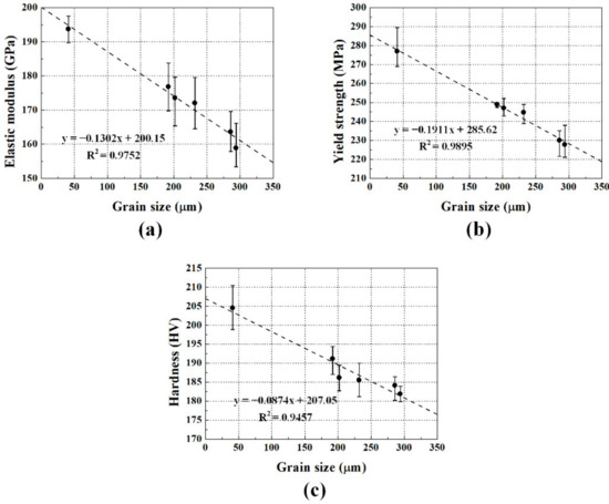Mechanical properties, including elastic modulus, yield strength, and hardness, were analyzed according to grain size. The elastic modulus and the yield strength were measured using tensile tests, and their average values and data ranges are shown in Figure 10a,b, respectively. Both mechanical properties decreased with increasing grain size. This material weakening was attributed to the smaller number of grain boundaries that act as barriers to dislocation movement [4,5,22]. The change in elastic modulus with grain size, shown in Figure 10a, could also be correlated with the change in ultrasonic velocity, shown in Figure 5. It is well known that ultrasonic velocity is a function of elastic modulus and material density. The decrease in the elastic modulus corresponds to a decrease in the ultrasonic velocity, assuming there is almost no change in material density, even if grain size changes. The increase in grain size also caused a decrease in hardness, as shown in Figure 10c. The reduction in hardness was also due to a decrease in the number of grain boundaries that prevent plastic deformation [22]. Overall, the increase in grain size caused a decrease in the number of grain boundaries, which weakened the mechanical properties.