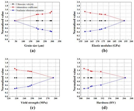 Linear and nonlinear ultrasonic parameters were correlated with grain size and mechanical properties, and the normalized values of ultrasonic parameters as a function of the material properties were compared, as shown in Figure 11. These values were normalized with respect to the values of each ultrasonic parameter in the intact specimen. The sensitivity of ultrasonic parameters to material properties was determined by the slope of the fitted line when the correlation was linearly fitted. The sensitivity of each ultrasonic parameter is summarized in Table 2. The sensitivity of the ultrasonic attenuation coefficient and the nonlinear ultrasonic parameter to changes in grain size and mechanical properties was much better than that of the ultrasonic velocity. In particular, the sensitivity of the nonlinear ultrasonic parameter was the best, and it was about 25% higher than that of the ultrasonic attenuation coefficient. The experimental results summarized here suggest that the use of the nonlinear ultrasonic parameter would be more effective in characterizing the material properties than the linear ultrasonic parameters.