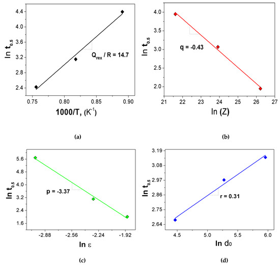 - The dependence of t0.5 on temperature and initial austenite grain size are lower than that observed for strain and strain rate parameters. The effect of temperature can be attributed to an accelerating effect of carbon on the kinetics of SRX. This conclusion is drawn from the observation that the apparent activation energy for SRX was relativity low (122 kJ/mol). Although the interrupted tests did not exceed the critical strain () to start the DRX (softening mechanism that does not depend on the initial austenite grain size for the final grain structure), the initial grain size effect on the SRX rate was very small or negligible within the investigated range.
