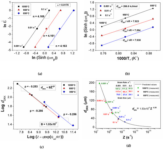 - The relationship between temperature, strain rate and the dynamically recrystallized grain size (dDRX) was determined by an expression that relates the refined grain size and the Zener-Hollomon parameter (Z) raised to an exponent. The recrystallized experimental grain size for a temperature range from 1050 to 850 °C and strain rates between 0.001 and 0.1 s−1 was 197.4 to 24.1 μm, respectively. Although, the predicted refined grain size could reach values as low as 1.5 μm at 800 °C and 1000 s−1.