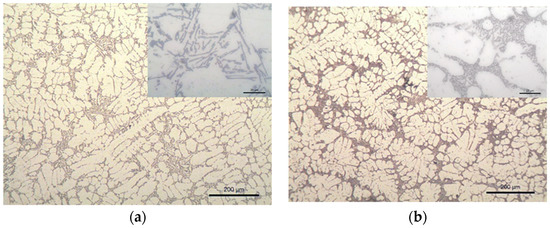 LM images of (a) S1 (non-modified), and (b) S2, modified with 0.1 wt.% SiC + Cu. Magnified views in the top right corner show the eutectic morphology.
