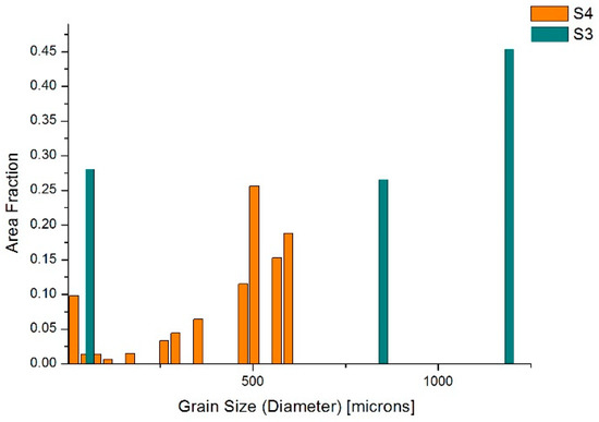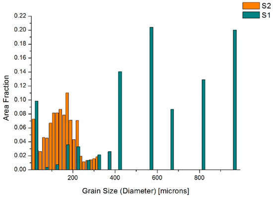 Grain diameters vary from 28.53 µm to 967.47 µm for S1 and from 14.58 µm to 316.15 µm for S2. Тhe largest area fractions (each 0.2) in S1 is taken of grain diameters 967.47 µm and 572.13 µm, while in S2 the largest area fractions are taken by grain diameters 173.302 µm, which cover an area fraction of 0.11, and 141.557 µm, 125.685 µm and 109.812 µm cover an area fraction of 0.08 for each group.