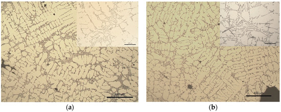 Light optical microscopy analysis (Figure 6a,b) did not show as strong change in microstructure as in couple of samples S1 and S2. Nevertheless, SDAS was decreased with 7.8%, and the microhardness was increased with 3.5% (Table 3).