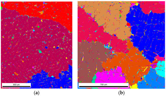 Samples were prepared for EBSD analyses via routine procedure, and the final step was 30 min mechanical polishing with 35 nm colloidal silica (OPS). They were analyzed by means of an EBSD system attached to a Quanta450 FEG-SEM *(Thermo Fisher Scientific, Electron Microscopy Solutions, 5350 NE Dawson Creek Drive Hillsboro, OR, USA) operating at 20 kV. The final aperture was 30 µm, which ensures a probe current of 2.4 nA. The sample was tilted 70° towards the EBSD detector, the working distance was 16 mm, and the analyzed area of 2 × 2 mm² was scanned in a hexagonal scan grit with a step size of 1 µm. All orientation data were acquired with OIM-Data Collection version 6 software (AMETEK Materials Analysis Division, Mahwah, NJ, USA) and postprocessed and analyzed with OIM-Data Collection version 6 software (AMETEK Materials Analysis Division, Mahwah, NJ, USA). The original data were postprocessed by clean up procedure including only grain confidence index standardization (CI > 0.1; min misorientation of 5° and minimum 7 pixels per grain). All points with a confidence index lower than 0.1 were removed later from the measurement as dubious.
