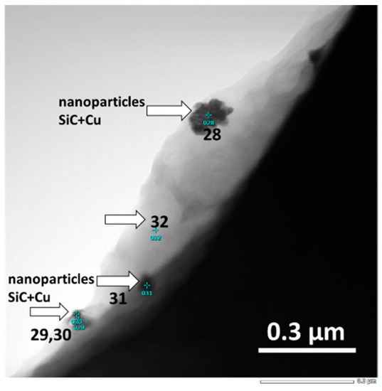 Several specific points corresponding to the microstructure were analyzed. Point #32 (Figure 10) corresponds to the grain interior where no precipitates are found, and the chemical composition is in good agreement with the average composition of the Al alloy (see Table 1). This point is used as a kind of calibration point for the EDS measurement. The increased amount of Cu measured in this point is associated to a signal that may originate from the copper grit on the STEM sample holder. Such effects are common in the EDS/STEM analysis. Having in mind that the SiC nanoparticles were cladded with Cu, it is reasonable to accept for a specific indicator for the nanoparticles the increased Cu content and the appearance of C peaks in relevant sample points. The presence of significantly high concentrations of Cu and C at points with numbers 28–31 indicates the presence of nanoparticles or their conglomerates. Isolated nanoparticles were not found in the microstructure, but conglomerates of nanoparticles were frequently observed. The size of these conglomerates was around 130 nm, whereas some individual nanoparticles with a size between 20 nm and 40 nm can be distinguished inside the conglomerates (see Figure 10). Similar effect of agglomeration was frequently observed and reported [49] because of the attractive Van der Waals forces. It is interesting that at some points an increased concentration of oxygen was measured (28–32). Most probably the reason for the increased oxygen content is in the oxidation of cladding metal Cu, as nanoparticles were not stored in inert environment before use.