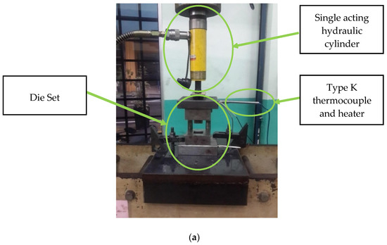 For the experimental apparatus and set-up, an elevated deep drawing process has been shown in Figure 1a–d. In addition to that, to regulate and control the die set temperature, a temperature controller and heater were used. A set of type K thermocouples is used to sense the temperature, and the reading displayed on the controller. The punching force generated from a single acting hydraulic cylinder and being control by a hydraulic pump. It has 101 kN capacity of force with a 105 mm stroke to deform the blank. The punching force measured by using insulated force sensor with data acquisition system. From the figure we can also observe that the die set consists of upper and lower die shoes, a plunger, a die and a blank holder. The upper and lower die shoes act as the guide for the plunger and die as well as ensuring the blank is concentric with the die cavity. Additionally, the heater and thermocouple are also installed on the die shoe, so that the heat radiates to the plunger and die.