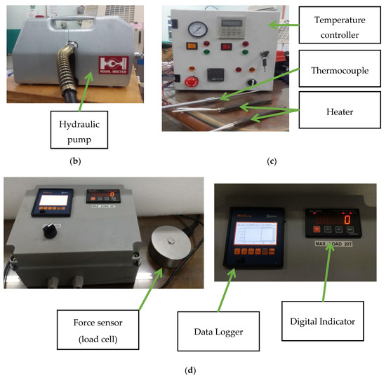 (a) Experimental setup; (b) hydraulic pump; (c) temperature controller heater and type K thermocouple; and (d) force sensor with the data acquisition system.