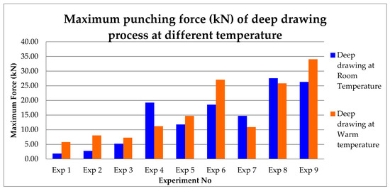 Graphical representation of the maximum punching force (kN) of the deep drawing process at different temperatures.