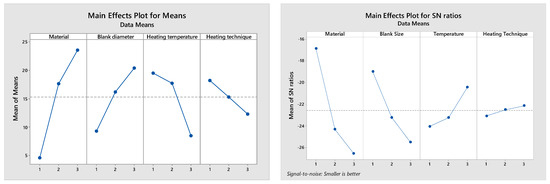 From Figure 4, the main effects plot for means and S/N ratios for the elevated temperature deep-drawn circular cup can be seen. S/N ratio is of common interest for optimization for maximum punching force which is smaller the better. On the other hand, the main effect plots are used to determine the optimal design conditions to obtain the optimal punching force.