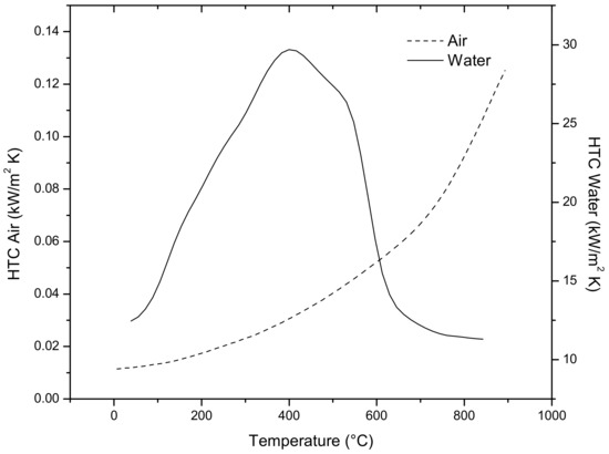 The accuracy of the temperature evolution predicted by finite element method (FEM) models is extremely sensitive to the quenching conditions [7,8]. In particular, one of the conclusions presented in reference [7] is that the HTC is the most critical property to obtain accurate temperature and residual stress predictions. In this regard, it has been found that the use of static values of HTC in FEM models yields results substantially different compared to models employing temperature-dependent HTC for the purpose of simulating cooling curves and stress profiles both in gas [9,10] and liquid quenching [7]. Therefore, the use of a temperature-independent HTC should be avoided in oil and water quenching baths, although it may be useful in salt baths [11]. There has been a considerable number of papers where the characteristic time- and temperature-dependent HTC curves for a Jominy end quench test [12,13,14,15] have been studied and validated [16,17]. In a recent review [18], it is stated that for simple geometries (such as the one studied in this paper), using a temperature-dependent only HTC should be accurate enough. Furthermore, this reference suggests using a smooth and continuous HTC and avoid a piecewise definition (such as those calculated by inverse methods) to improve FEM model convergence.