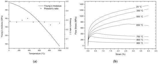 Temperature-dependent mechanical and thermo–physical properties, shown in Figure 5 and Figure 6 respectively, were obtained from literature or calculated through commercial software JMat Pro 9.0® (Sente Software, Surrey, UK). Atomic emission spectroscopy (AES) was used to obtain the samples chemical composition shown in Table 1 and compared to the AISI standard.