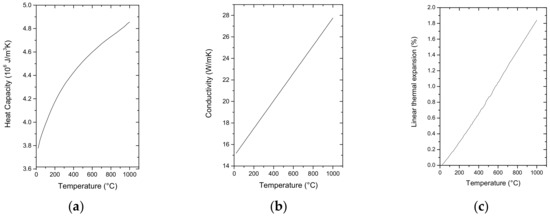 Thermo–physical properties (a) Heat capacity [27,29]; (b) Conductivity [26]; (c) Linear thermal expansion [29].