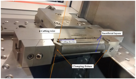 After cooling, specimens were cut using the wire EDM technique, employing an Agie Charmiles Cut 100® machine using bronze wire of 0.1 mm in diameter and 1 mm per minute cutting speed. Rigid fixation arrangement was necessary to avoid artifacts [22,23,30], in addition, the trajectory of cut started from high stressed edge reducing the plastic deformation effects [31,32,33]. Precautionary measurements were taken to guarantee cutting plane stability as: thermal equilibria between sample and surroundings prior to cutting, usage of sacrificial material [34] to ensure conductivity between cutting sides avoiding transient current effects [35], fixtured set-up can be seen on Figure 7.