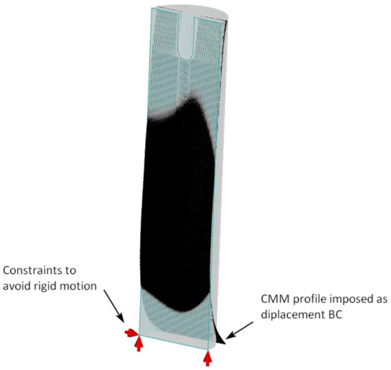 A surface was fitted to the averaged cloud using second grade spline functions and several points spacing (knots density) with a characteristic RMS value. The fitted surface was then imposed as displacement boundary condition over the nodes in FEM model using Abaqus® (Abaqus 6.13. Dassault Systemes, France) (Figure 9). The mesh in this model has C3D8 elements of 0.3–1.5 mm in size. Only one plane of symmetry was used to impose the CMM measurements because of the non-symmetric profile obtained.