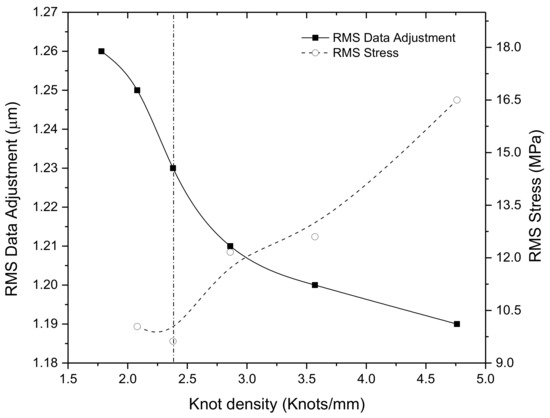 As mentioned earlier, several Abaqus simulations were carried out using different knots density (also called fitting level). Following Prime’s method [25], the result with the smallest variation in both RMS nodal stress and in RMS data adjustment was selected as the best fitting, as shown in Figure 10.