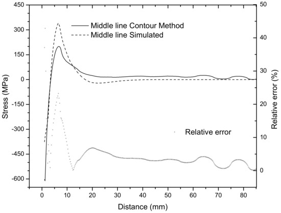 For the sake of a better comparison and taking into account the sample geometry, stress profiles along the center line on the cut plane (y = 12.5 mm) will be referred as r = 0 mm and at y = 18 mm, will be identified as r = 5.5 mm in both results are presented in Figure 13 and Figure 14. Figure 13 shows that the residual stress maximum position is accurately calculated by the FEM model. However, the maximum tensile residual stress magnitude is overestimated by approximately 150 MPa (approximately 20%). Interestingly, the difference between the calculated and measured maximum compressive residual stress is underestimated by approximately 150 MPa as well. As can be seen, the overall error calculated as root mean square error (RMSE) is 41.15 MPa for the center line. Although the error can be seen as relatively high at 20% at the maximum residual stress peak, it quickly goes down to stay at approximately 5%. The position from the quenched end of said maximum residual stress peak is adequately calculated.