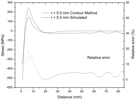 Figure 14 shows a similar plot for a linear stress profile calculated at r = 5.5 mm, displaying a similar fitting where the residual stress maxima are in corresponding positions, but the magnitude is overestimated by approximately 100 MPa (15%). The RMSE is slightly lower than the one calculated for the center line at 33.84 MPa.