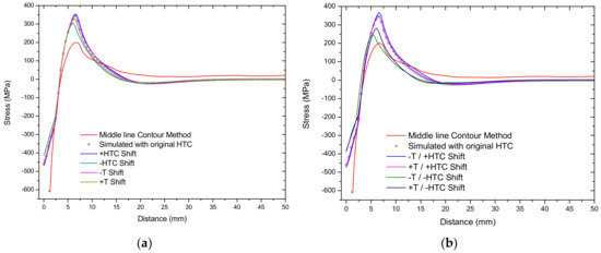 Simulated stress profiles on middle line using hypothetical HTC values: (a) ±T and ±HTC; (b) ±T/±HTC combinations.