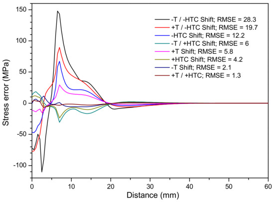 Hypothetical heat transfer coefficients were introduced to heat treatment model, calculated residual stress profiles and original HTC model results are compared in Figure 15a,b, alongside to its characteristic error in Figure 16.