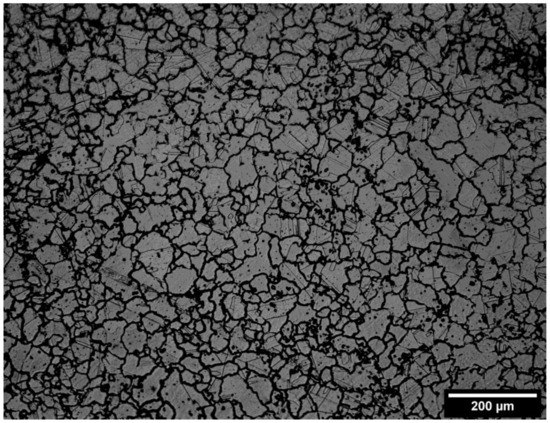 Following Equation (3), the SFE for the stainless steel quenched in this study is 19.32 mJ m−2. According to Shen [38], twinning is more favored when the SFE is above 18 mJ m−2, whereas martensite formation is more likely to occur when the SFE is below 18 mJ m−2. It can be seen that for this particular steel composition, twinning is more favored than martensite formation. This was further analyzed by observing the microstructure at the maximum tensile residual stress position. The microstructure is shown in Figure 18. The microstructure is fully austenitic, with several twinned austenite grains.