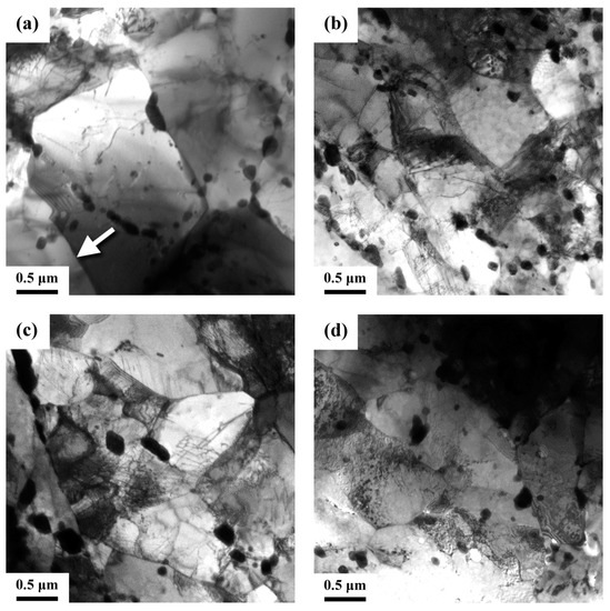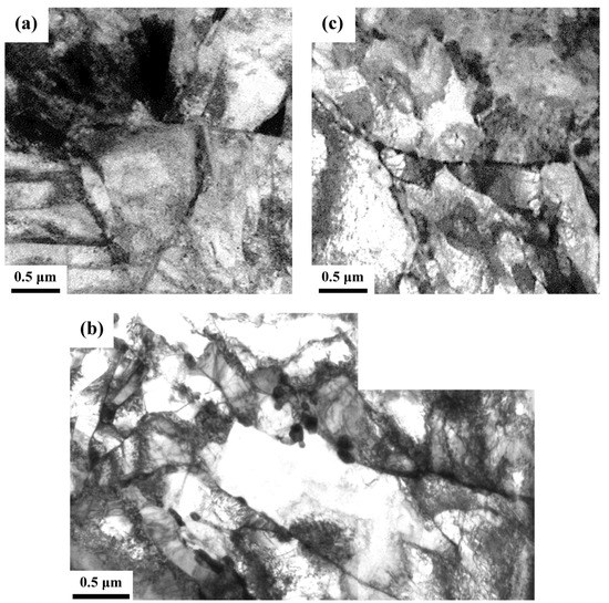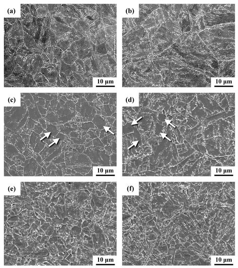 In the over-tempered (OT) specimens, a decrease in the carbide density and an increase in the carbide size were observed (Figure 1c,d). In addition, the lath morphologies of the LT-OT and HT-OT specimens were not as prominent as those of the LT and HT specimens. It was noticed that the precipitates in the OT specimens were distributed less uniformly than those in the counterpart substrates. Another interesting finding was the presence of fine grains in the LT-OT and HT-OT samples. Some patches (indicated by arrows) in the OT specimens comprised few precipitates and displayed a vague lath morphology, possibly due to the over-tempering. Newly formed fine grains were more likely to be observed in both PT specimens, as shown in Figure 1e,f. Uneven grain sizes were also observed in the HT-PT sample (Figure 1f). In previous works [23,24], the as-welded ICHAZ (or partial transformation zone) consisted of fine ferrite subgrains and fresh fine martensite, which were responsible for a refined granular structure. The coalescence of carbide-free lath martensite in the normalized and tempered specimen during the heating cycle leads to the formation of ferrite subgrains in the PT specimen [23].