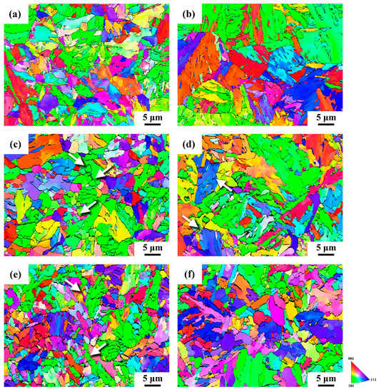 The IPFs of the LT-PT and HT-PT samples are shown in Figure 2e,f. Numerous fine grains were more easily visible in the LT-PT sample (Figure 2e) than in the HT-PT sample (Figure 2f). Some elongated packets decomposed into several fine subgrains (indicated by the arrows) in the LT-PT specimen. Overall, the HT-PT specimen (Figure 2f) still retained traces of coarse martensite packets and grain sizes, possibly due to the short-time thermal treatment. However, some very fine grains were located at the prior austenite grain boundaries (PAGBs). Those newly nucleated grains were the result of heating the Cr-Mo steels in the two-phase region.