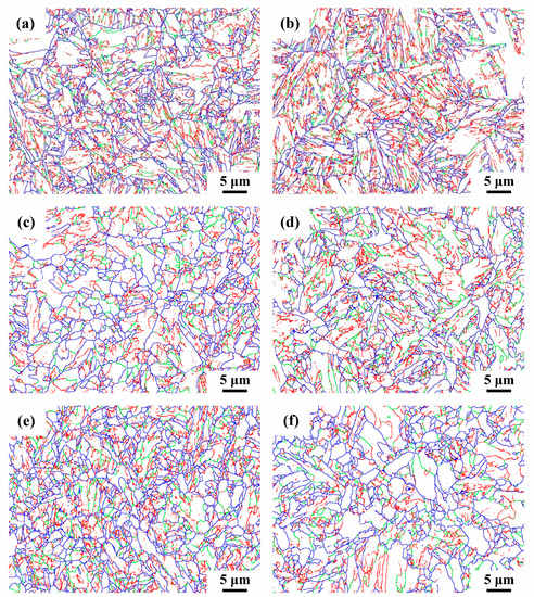 Grain boundary maps showing the details of the austenite grain boundaries and sub-boundaries of various samples are displayed in Figure 3. It has been reported that the low-angle boundaries (subgrains), including the lath and block/packet boundaries within the matrix, have misorientations of 2–15° and 50–60°, as classified by measuring the misorientation between adjacent grains. Prior austenite grain boundaries are identified as high-angle grain boundaries with misorientations of 15–50°. In this work, the low-angle grain boundaries are indicated by red (1–5°) and green (5–15°) lines, whereas high-angle grain boundaries (15–62.5°) are indicated by blue. The grain boundary characteristics of the LT and HT specimens are shown in Figure 3a,b. It was obvious that the greater number of high-angle grain boundaries (blue) in the LT specimen (Figure 3a) accounted for its finer grain size than that of the HT specimen (Figure 3b). The larger grains in the HT specimen were more likely to have coarse martensite packets aligned in the same direction than were those in the LT specimen.