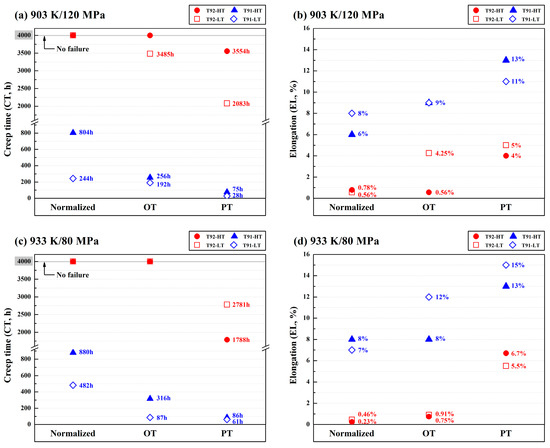 Creep time and elongation of distinct samples after short-term creep test strained at (a,b) 903 K/120 MPa and (c,d) 933 K/80 MPa.