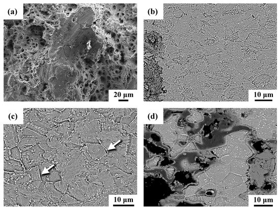 As shown in Figure 6b,d, the fractured samples exhibited low ductility, whereas the unfractured ones showed no change in sample length. The typical fractured surface features and microstructures near the fracture zones of creep-ruptured samples are shown in Figure 7. For microstructural observations, the ruptured samples were cut and subjected to metallographic preparations for further SEM examinations in backscattered-electron (BSE) image. Regardless of the testing condition, the fracture surfaces of all the creep-ruptured samples consisted of predominantly dimple fracture mixed with a little intergranular separation (Figure 7a). Under the testing condition of 903 K/120 MPa, the LT-OT and LT-PT samples displayed similar microstructures near the fracture zone, that is, a refined granular structure with coarse precipitates decorating the grain boundaries (Figure 7b). The original lath features present in the samples were barely visible in the fracture zone (Figure 7b). Moreover, the HT-PT sample had mixed grain sizes with coarse precipitates at the grain boundaries (Figure 7c). It was noticed that the initiation and propagation of the crept microcracks were associated with high-angle grain boundary separations. Moreover, the vague trace of a coarse martensite package in the HT-PT sample could still be seen. Such microstructural characteristics confirmed that the HT-PT sample was more resistant to creep failure than was the LT-PT sample. However, a great change in microstructural features occurred in the HT-PT sample strained under the 933 K/80 MPa condition. Fine grains with coarse precipitates dispersed intra- and intergranularly were present near the fracture zone of the crept HT-PT samples (Figure 7d). It was deduced that dynamic recrystallization of the HT-PT sample, which occurred under straining at 933 K, accounted for the obvious decay of its creep resistance. However, the exact mechanism of such great change has yet to be determined.