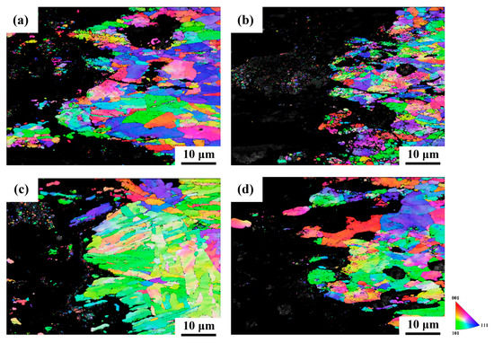 IPF maps of the fracture zones of the (a) LT-OT, (b) LT-PT, and (c) HT-PT samples tested at 903 K/120 MPa; (d) HT-PT sample tested at 933 K/80 MPa.