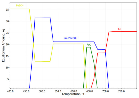 Figure 2 shows the equilibrium amounts of iron containing phases as a function of the roasting temperature during the carbothermic reduction of red mud. It can be seen that full reduction of iron into the metallic form according to Reactions (3)–(11) was possible above 710 °C. However, a previous experimental study [33] pointed out that a high iron metallization degree after the carbothermic reduction of red mud can be achieved only at temperatures above 1050 °C.
