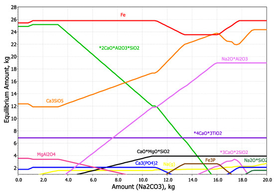 Effect of Na2CO3 addition on the equilibrium amounts of different phases at 1100 °C.