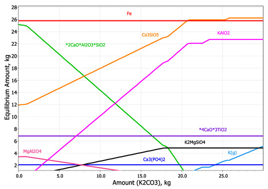 Effect of K2CO3 addition on the equilibrium amounts of different phases at 1100 °C.