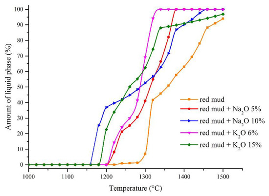 Thermodynamic calculation of the liquid phase amount was performed using FactSage 7.1 software (Thermfact, Montreal, Canada; GTT-Technologies, Herzogenrath, Germany) [42] with the FToxide database for iron-free red mud with K2O or Na2O addition to the following composition: 17.48% SiO2; 23.69% Al2O3; 7.11% TiO2; 47.78 CaO; 2.03% MgO; 1.91% MnO.