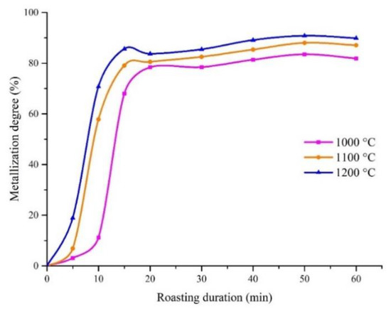 Figure 6 shows the influence of the roasting temperature and duration on the iron metallization degree for red mud without carbonate additions. The presented data indicated that the first 20 min of the roasting was sufficient to metallize more than 78% of the iron in the temperature range of 1000–1200 °C. After that, the metallization degree grew slowly and remained in the range of 78–90%. An increase of temperature also promoted the iron metallization process insignificantly.