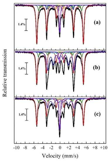 The Mössbauer analysis was performed using a spectrometer MS-1104Em (ZAO Kordon, Rostov-on-Don, Russia) at room temperature. The 57Co nuclei with 47 mCi activity in a Rh matrix were used as the source. The Mössbauer spectra were processed using SpectrRelax 2.4 software (Lomonosov MSU, Moscow, Russia) [43].