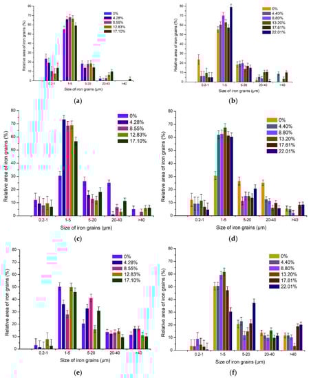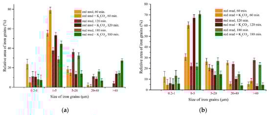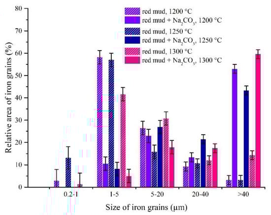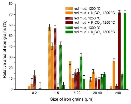Figure 9 shows the influence of temperature and the amount of alkaline additions on iron grain growth. Grains with a size of 1–5 μm represented the reduced iron particles with the biggest part of the relative area.