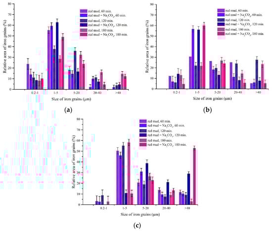 Effect of roasting time on size of iron grains with addition of 17.1% Na2CO3: (a) 1000 °C; (b) 1100 °C; (c) 1200 °C.