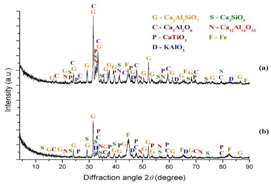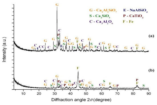 Figure 14 and Figure 15 show the XRD patterns of iron concentrates (magnetic fraction) and tailings (non-magnetic fraction), and Table 4 indicates the elemental composition of the tailings. The XRD pattern of the concentrates obtained after magnetic separation of the samples with alkaline additions showed that the main phase was metallic iron with minor content of iron-free minerals contained in the tailings. This result demonstrated that no full gangue-iron grains’ separation could occur at these conditions. The main tailings’ phases at both roasting conditions were gehlenite (2CaO·Al2O3·SiO2), tricalcium aluminate (3CaO·Al2O3), tricalcium silicate (3CaO·SiO2), perovskite (CaO·TiO2), and non-extracted metallic iron. The tailings obtained from the sample with 22.01% K2CO3 besides the above mentioned phases also contained potassium aluminate (KAlO2) and mayenite (12CaO·7A12O3). The main sodium phase of the tailings obtained in the sample with 17.1% Na2CO3 was NaAlSiO4.