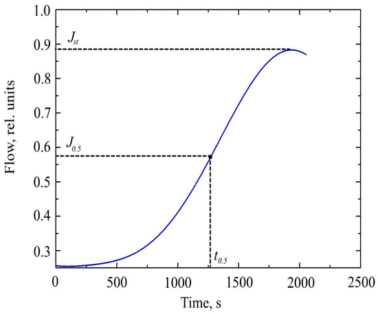Studying the dependence J(t) (Figure 2), we can distinguish the characteristic point, which is the time of establishment of half of the stationary flow t0.5.